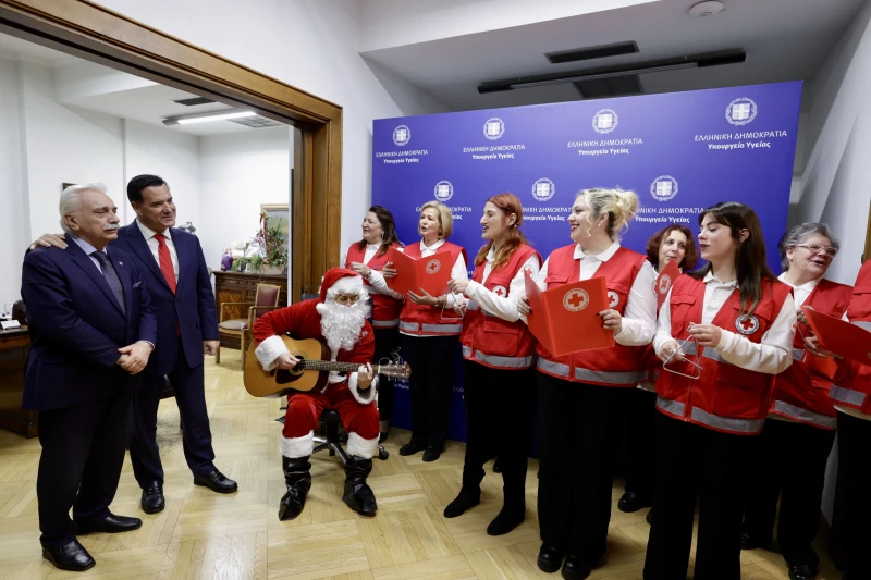 Χριστουγεννιάτικα κάλαντα από εθελοντές του Ελληνικού Ερυθρού Σταυρού στον Υπουργό Υγείας Άδωνι Γεωργιάδη