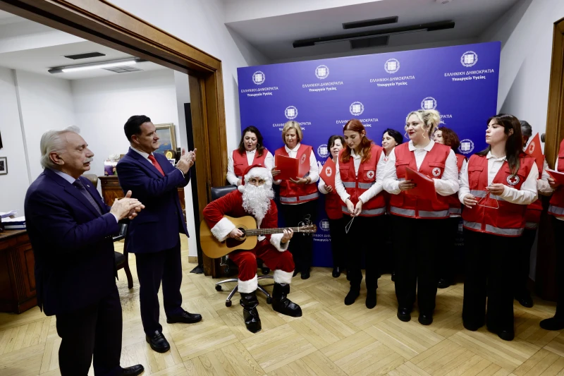Ο Υπουργός Υγείας Άδωνις Γεωργιάδης υποδέχτηκε σήμερα, Τετάρτη 24 Δεκεμβρίου 2025, στο Υπουργείο Υγείας, εθελοντές του Ελληνικού Ερυθρού Σταυρού για να του πουν τα κάλαντα των Χριστουγέννων. Το παρών έδωσε ο Πρόεδρος του Ελληνικού Ερυθρου Σταυρού, Αντώνης Αυγερινός.
